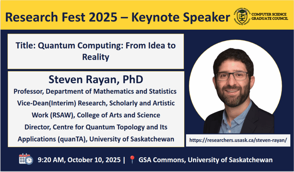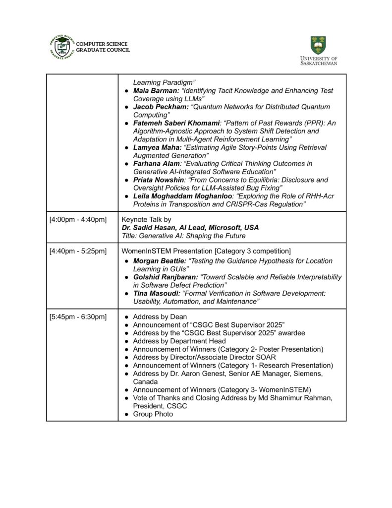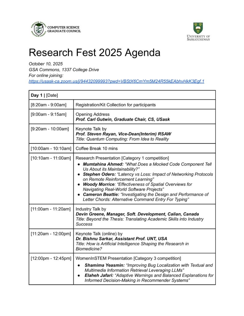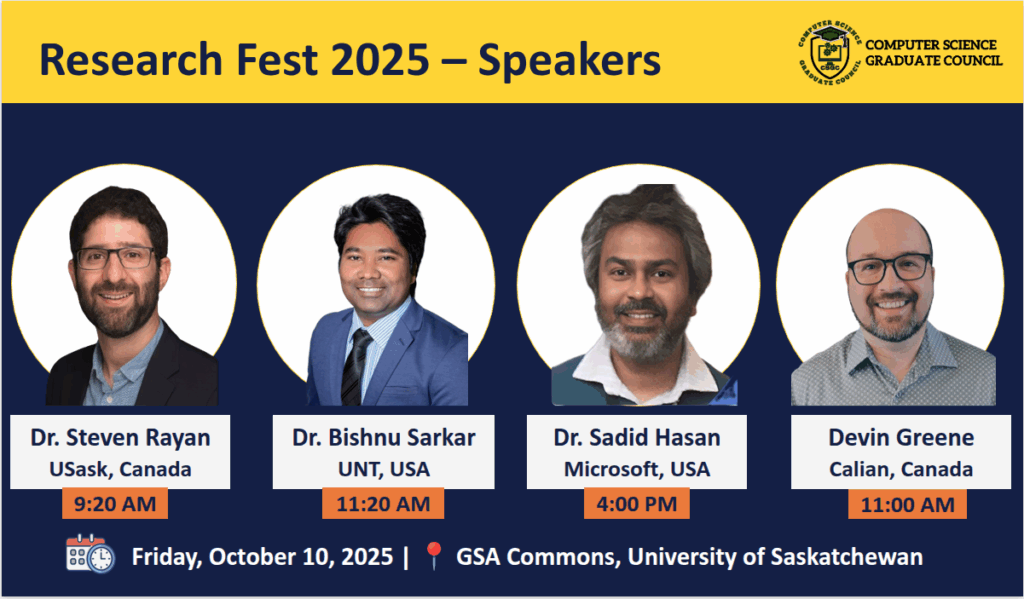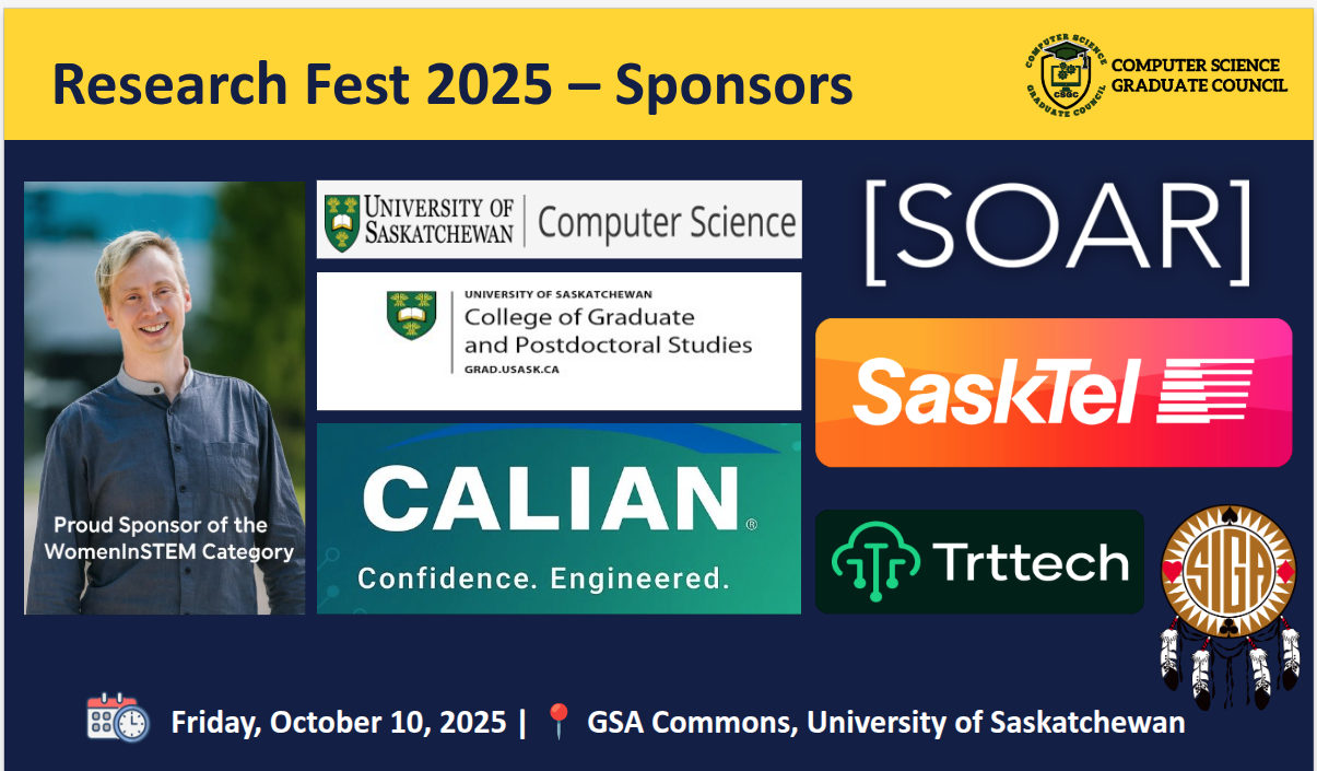 We are delighted to welcome you to the Research Fest 2025, also known as the 9th Symposium on Innovations in Computer Science and Applied Computing (ICSAC), a celebration of innovation, creativity, and academic excellence within the Computer Science and Bioinformatics research community.  This event provides a platform for graduate students and researchers to share their work, exchange ideas, and inspire one another in advancing knowledge across diverse areas of computing and related disciplines. Research Fest 2025 is co-partnered by the Software Analytics Research (SOAR) and the Department of Computer Science, University of Saskatchewan.