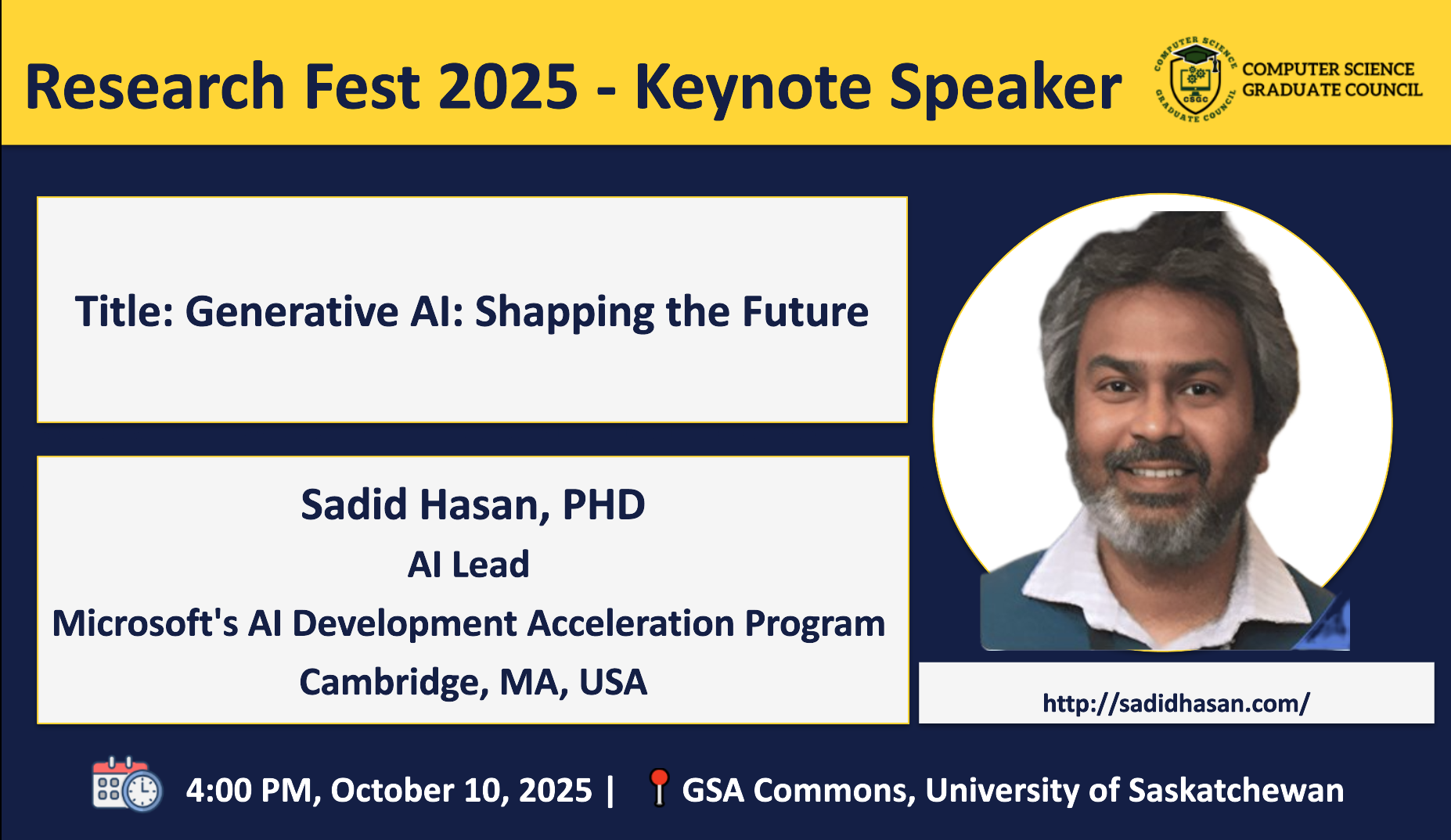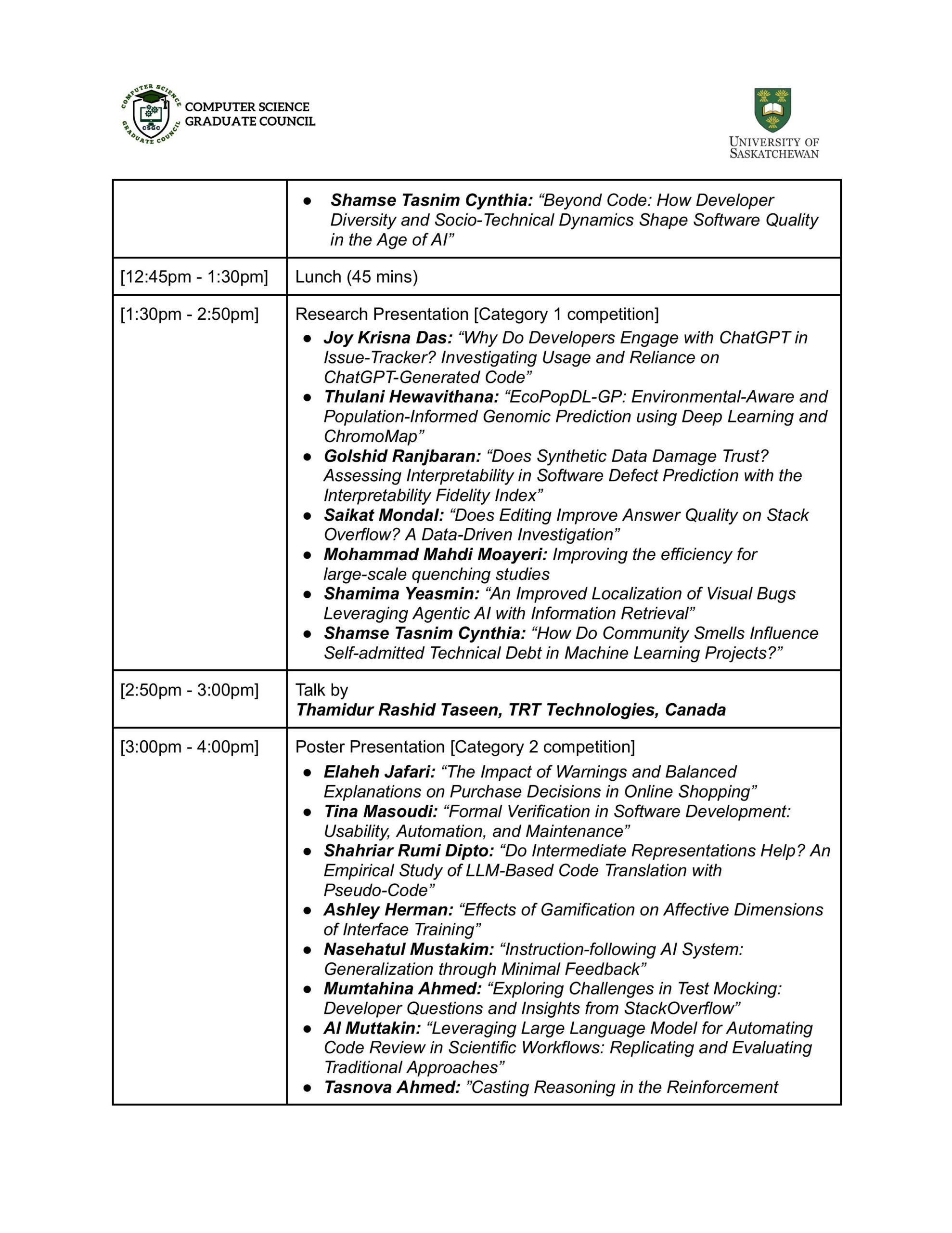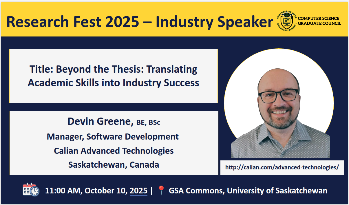 We are delighted to welcome you to the Research Fest 2025, also known as the 9th Symposium on Innovations in Computer Science and Applied Computing (ICSAC), a celebration of innovation, creativity, and academic excellence within the Computer Science and Bioinformatics research community.  This event provides a platform for graduate students and researchers to share their work, exchange ideas, and inspire one another in advancing knowledge across diverse areas of computing and related disciplines. Research Fest 2025 is co-partnered by the Software Analytics Research (SOAR) and the Department of Computer Science, University of Saskatchewan.